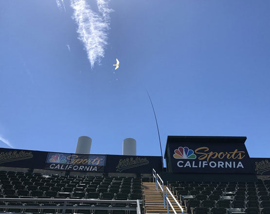 They launched their first Falcon Crop Protection FrightKite, which flew high above at flag height, protecting the seats below. The results were immediate from that first game on June 15, 2017: no more pest birds in the immediate area during the entire game AND the A's beat the Yankees 8-7 in a 10th-inning comeback win. Although the A's had a hand in the win, the distinct lack of birds was 100% thanks to Falcon Crop Protection