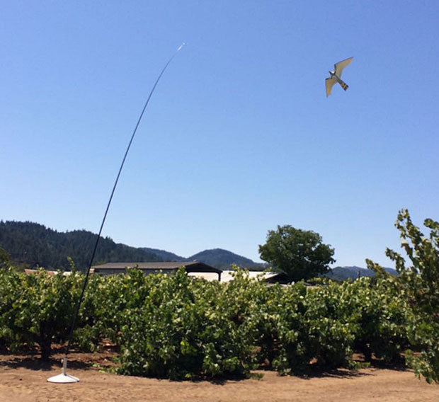 The shape of the Falcon closely replicates a real falcon as does it color and movements which are always changing. Typical "scare" repellents like owls and scarecrows etc do not move in a random manner and birds quickly learn that they are nothing to be scared of and continue to invade the vineyard. Not so for the Falcon.